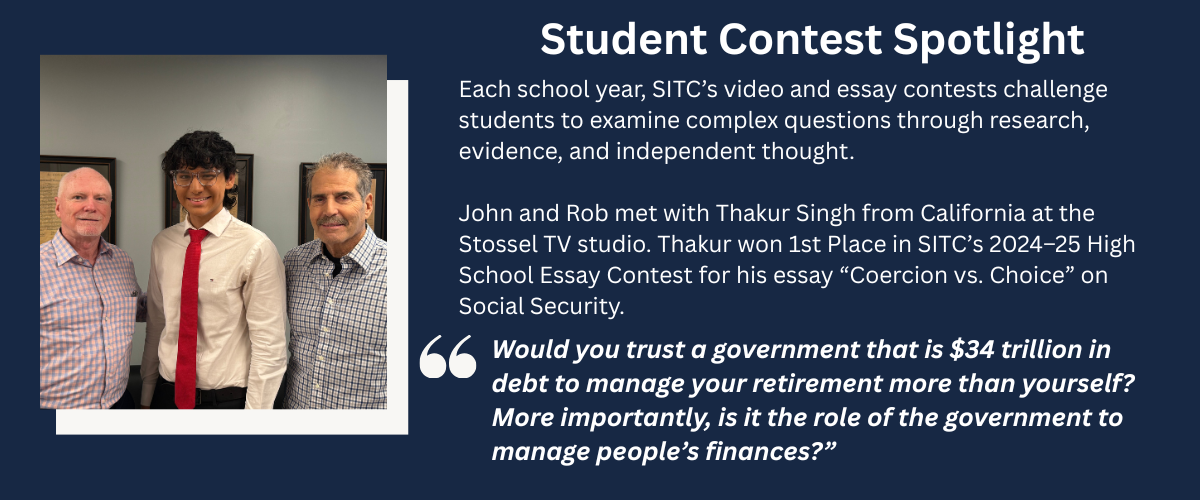 In 2025, John Stossel keynoted YALCON, inspiring top student leaders to defend liberty. The SITC team exhibited materials and led a workshop for educators at the National Council for Social Studies Annual Conference in Washington, DC, and showcased resources at the National Invitational Tournament of Champions in Tulsa, OK.