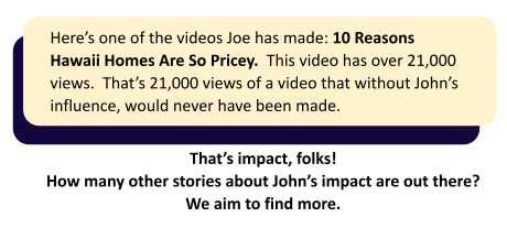 You can read more of Joe’s story later in this report. Over the next year, we’ll bring you more such stories. If you have a story about the impact John has had on you or someone you know, please email Rob@centerforindependentthought.org and let us know, and if you have any questions about this report or our work, you can email them to us and we’ll be sure to answer them.